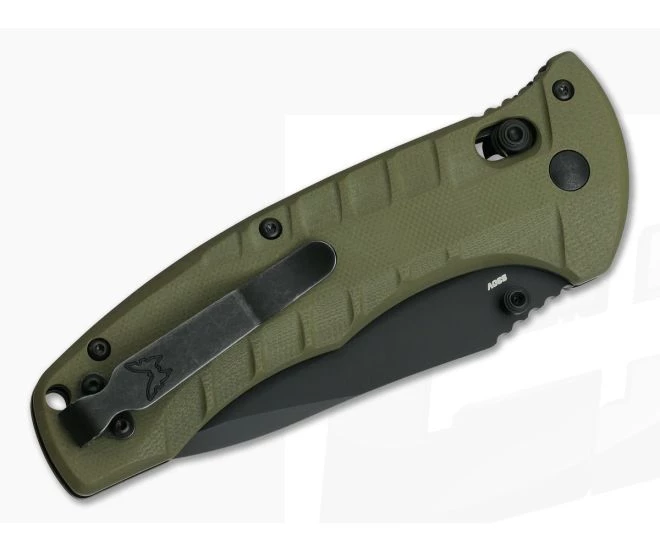 Handle: Full, black oxide coated, stainless steel liners form the foundation for the rock solid, ambidextrous, AXIS lock mechanism and G10 handles. The Olive Drab G10 handle scales are contoured and textured for optimum comfort and security with a subtle dual guard that locks the knife in the hand. The handles are open construction for ease of cleaning and maintenance with black barrel spacers for a tactically subdued knife. The smooth AXIS lock delivers strength and reliability for hard use and adverse conditions.