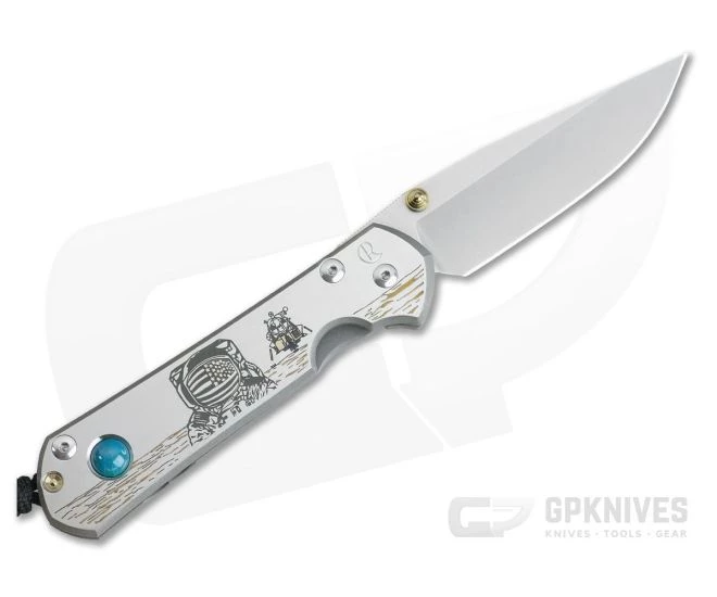 The Chris Reeve Large Sebenza 21 Computer Generated Graphic “Lunar Landing” features a polished front handle with a classic USA moon landing graphic on the front titanium slab with gorgeous Chrysocolla Cabochon inlay playing the part of Earth. The Lunar Landing CGG Sebenza is a fine balance of form and function perfect for your pocket or collection. This left-handed version features full titanium construction with a stonewashed CPM-S35VN blade.