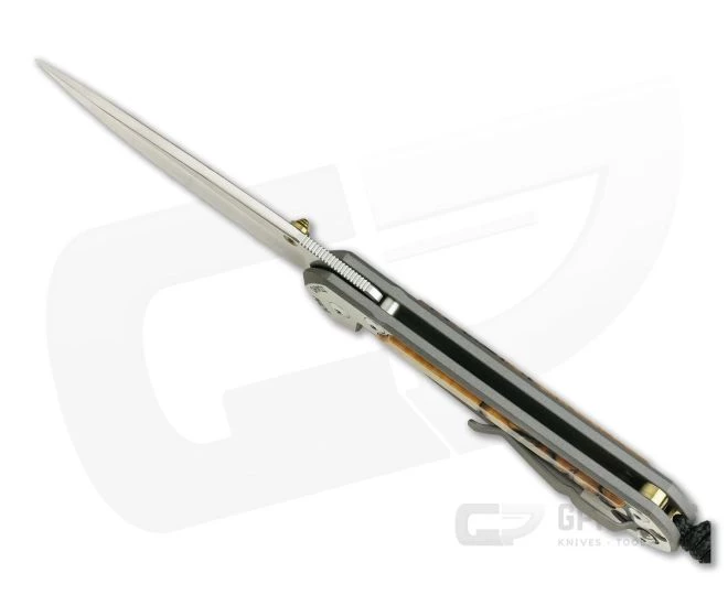 Handle: Made of precision machined and hand polished titanium slabs, the wood inlays are cut, smoothed and carefully secured in the front and back of the handle. A blasted Reeve Integral Frame Lock holds the blade solidly in the open position and can be easily disengaged. An attached black lanyard with gold Ti spacers and a blast finished titanium tip up carry pocket clip round out this truly handsome work of art.
