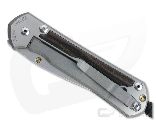 Handle: The dual slabs of 6AL4V titanium are satin finished and inlaid with Macassar Ebony wood. The front inlay is a large, single piece that lends a sleek elegance to the clean design. The Reeve Integral Lock utilizes the titanium frame to deliver “bank vault” like lockup. An upgraded Ceramic Ball Interface increases the reliability and life of the lock while offering an extra smooth operation of both lock and blade. The construction is completed with full titanium hardware including a gold anodized spacer and lanyard pin. A black nylon lanyard comes installed.