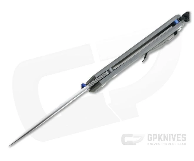 Handle: The front slab of 6AL4V titanium is beautifully satin finished, carved and anodized in a unique pattern while the frame lock side is finished in the standard sandblasted finish for traction. The Reeve Integral Lock utilizes the titanium frame to deliver “bank vault” like lockup. An upgraded Ceramic Ball Interface increases the reliability and life of the lock while offering an extra smooth operation of both lock and blade. The construction is completed with full titanium hardware including a titanium spacer and lanyard pin. A black nylon lanyard comes installed. DOB: August 27, 2020.