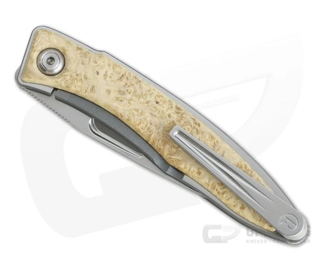 Handle: Smooth, warm and highly figured Box Elder Burl wood scales have been inlaid into the front and back of the satin finished titanium handle flats while the edges and lock bar are left a blasted matte gray for contrast. Stabilized Box Elder Burl, a type of Maple, is a wood known for its exquisite and sometimes rosy burls. Fit and finish on this timeless classic is outstanding while the Left Handed Reeve Integral Frame Lock delivers smooth operation and rock solid lock up for secure use.