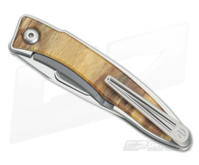 The Handle: Smooth Spalted Beech wood scales have been inlaid into the titanium handles on the front and back of the knife. Fit and finish on this timeless classic is outstanding. Optimum reliability with quality materials make the ideal gentleman’s carry.