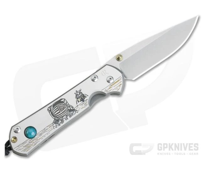 The Chris Reeve Small Sebenza 21 Computer Generated Graphic “Lunar Landing” features a polished front handle with a classic USA moon landing graphic on the front titanium slab with gorgeous Chrysocolla Cabochon inlay playing the part of Earth. The Lunar Landing CGG Sebenza is a fine balance of form and function perfect for your pocket or collection. This left-handed version is constructed from solid titanium with a stonewashed CPM-S35VN blade.
