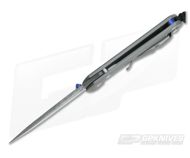 The Blade: The Small version gives its user 2.87 inches of polished, shaving sharp cutting edge built from Devin Thomas stainless damascus steel. This steel is folded over and over and over to create the maker’s preferred pattern. It is hollow ground for supreme sharpness and gives a unique look to the knife. A thumb ramp on the spine has perfect jimping, over half an inch and perfect placement. The rest of the spine is crowned, smooth and polished. This version features a perfect drop point for tackling the daily jobs. It operates via a blue anodized thumb lug on a pivot system using oversized bronze washers with grease-filled pockets for smooth, no friction operation. Lock up is always solid and reliable.