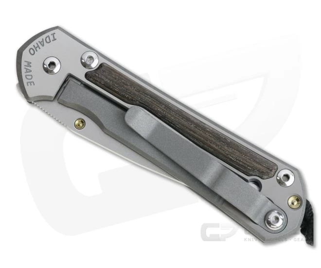 Handle: The dual slabs of 6AL4V titanium are satin finished and inlaid with Bog Oak wood. The front inlay is a large, single piece that lends a sleek elegance to the clean design. The Reeve Integral Lock utilizes the titanium frame to deliver “bank vault” like lockup. An upgraded Ceramic Ball Interface increases the reliability and life of the lock while offering an extra smooth operation of both lock and blade. The construction is completed with full titanium hardware including a gold anodized spacer and lanyard pin. A black nylon lanyard comes installed.