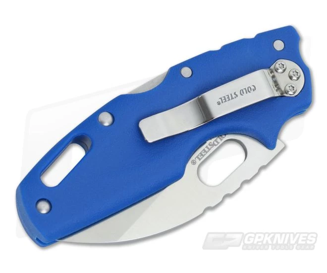 Handle: Cold Steel’s Griv-Ex material is an extremely tough nylon formula engineered with an enormous strength to weight ratio. This one is Blue in color and has hollowed out grooves along with light texturing for traction. Dual choils toward the blade allow the user to cut confidently with the knife locked in the hand with a secure and comfortable fit for the majority of users. A mid-back Tri-Ad lock is simple to operate while delivering optimal strength and security over the life of the knife. A slot is provided for lanyard attachment.