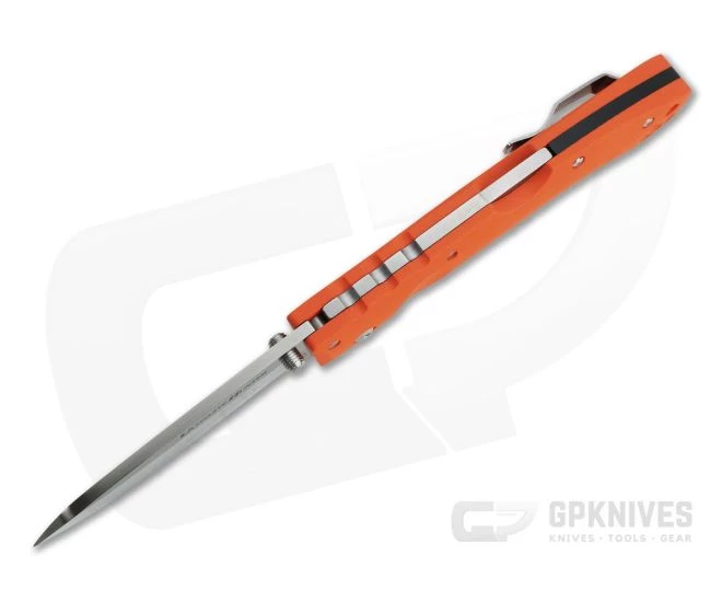 Handle: Durable and lightweight Orange G10 handles house the blade and Tri-Ad back lock mechanism. Milled and contoured the handles have a fine blasted texture for a secure grip in adverse conditions and an integral guard that protect from slipping onto the blade. The self adjusting Tri-Ad lock is rock solid and reliable, integrating a stop pin for added strength. While stiff at first the lock will break in with use and becomes even more secure over time. A generous hole is provided for lanyard attachment.