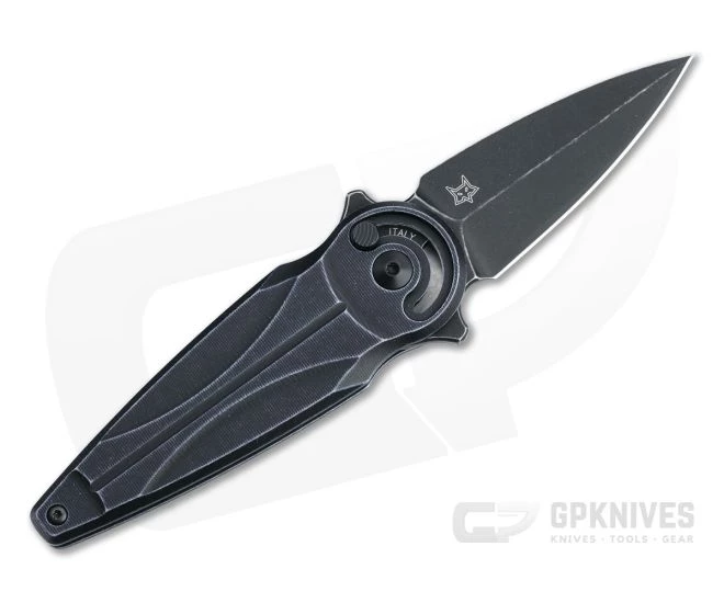 Blade: Finished in a rugged and discreet stonewashed black Idroglider coating, the dagger like N690Co blade rides smooth on a bearing pivot with fast or controlled left-hand deployment via the Radius lock button. The symmetrical blade has a single plain cutting edge for general utility and a powerful piercing point. The tang is marked “N690Co” and “Italy”, visible through the radial cutout while the blade is engraved with a small Fox logo on the front and a large Anarcnide logo across the back.