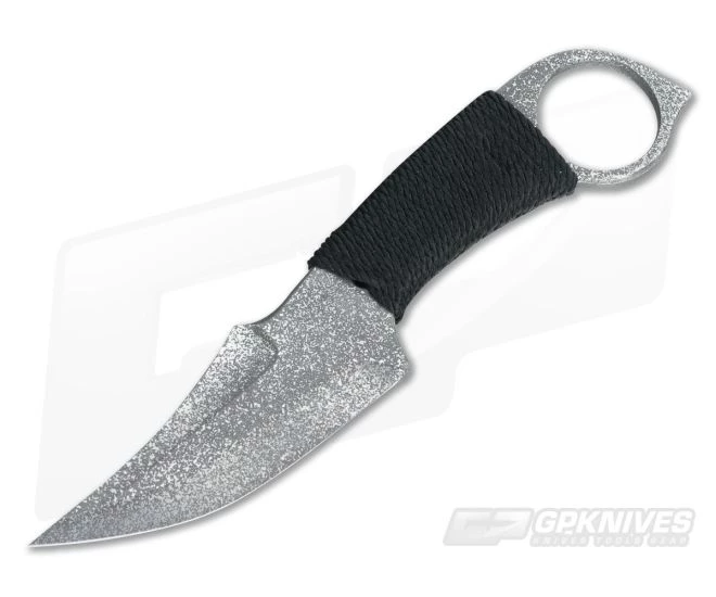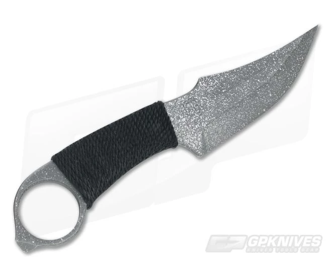 The Lobo Persian Saber Prototype from John Gray is a custom made fixed blade ring knife with wicked written all over it. The blade is an upswept “Persian” style with a robust saber grind and beefy, nearly-full-length, hollow ground swedge. The “Dark Rain” acid wash finish gives this knife a very post-apocalyptic feel. The pommel ring enhances security in the hand. This is a compact, multi-use cutting tool you can count on.