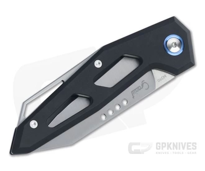 Handle: Dual slabs of anodized aluminum are chamfered for an ergonomic grip on the milled handle. Angular milled windows give a nice visual appeal and traction in the hand that pairs with the integral guard for a safe, secure grip. The proud back spring has a similar milled hole for lanyard attachment and is crowned for comfort and style. Stainless hardware and a blue anodized pivot collar complete the construction.