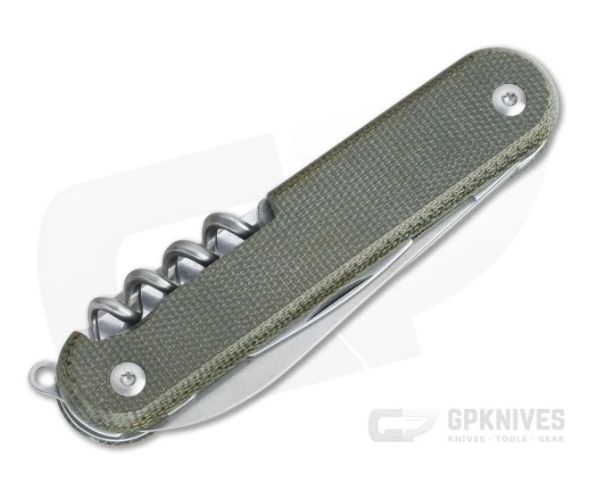 Handle: A simple oblong handle houses the stainless steel tools and blade with in stainless steel liners that support the removable scales. This version has handsome Green Canvas Micarta that offer a warm feel in the hand and good traction. Micarta is durable and weather resistant with a rustic look that fits well with this classic tool. Scales are attached via stainless Torx screws and are easily removed with the included T6/T8 Torx key for cleaning and maintenance. A stainless loop is provided for lanyard attachment.