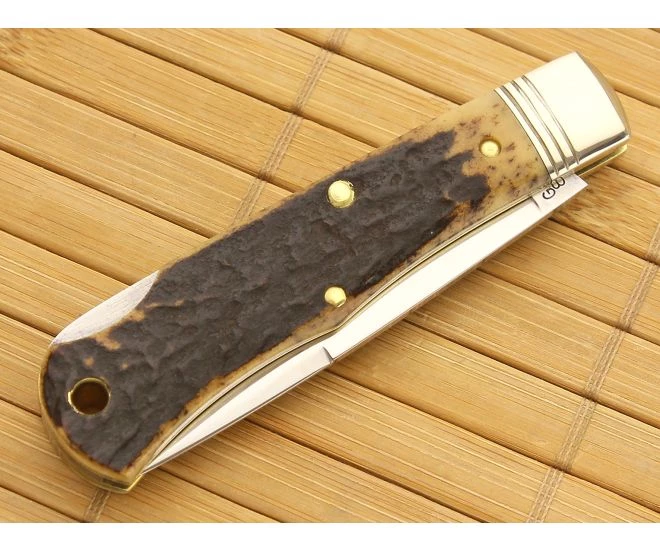 This Tascosa has one drop point polished 1095 carbon steel blade attached to a single nickel silver bolster. The Natural Stag Logo appears on the front. This lightweight, grippy and smooth functioning knife is perfect for daily carry. The stag has a nice grip for cutting.