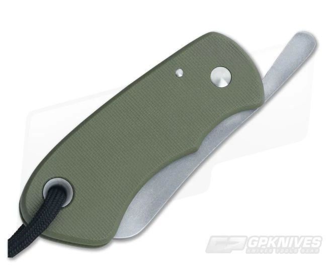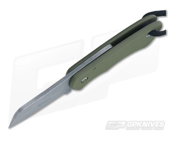 The Handle: Two slabs of lightly textured OD Green G-10 are grooved, contoured and comfortable. There are no liners or locking mechanisms of any kind. Just a simple cutting tool design. It does have a stop pin for the lever, lanyard hole and attached black lanyard with brass bullet casing bead.