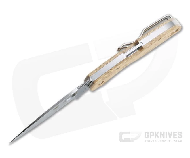 Handle: Built with skeletonized partial stainless steel liners and Birdseye Maple wood scales, the construction delivers a lightweight construction with a warm, organic feel and comfortable ergonomics in hand. The wood handles give a more traditional feel to this high performance, modern Gentleman’s folder. The stainless steel mid-back lock mechanism deliver secure carry and operation.