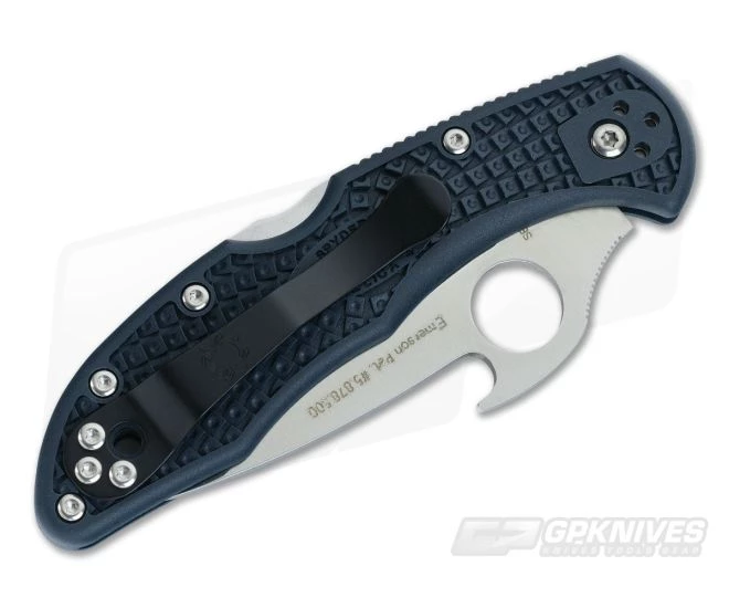 Handle: Spyderco’s Bi-directional textured FRN in a dark Blue/Gray offers exceptional traction in the hand with contoured edges and an ergonomic design that delivers comfort in the hand until the job is done. A sturdy mid-back lock design is easy to operate and comes with the Boye Dent further enhancing the security by preventing accidental disengagement of the lock when gripping the handle with heavy pressure. A hole at the pommel end allows for easy lanyard attachment.