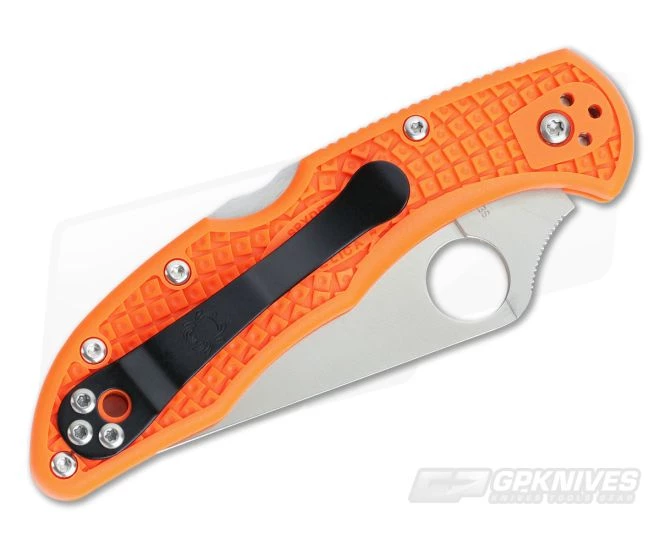 Handle: Spyderco’s Bi-directional textured FRN in Orange offers exceptional traction in the hand with contoured edges and an ergonomic design that delivers comfort in the hand until the job is done. A sturdy mid-back lock design is easy to operate and comes with the Boye Dent further enhancing the security by preventing accidental disengagement of the lock when gripping the handle with heavy pressure. A hole at the pommel end allows for easy lanyard attachment.
