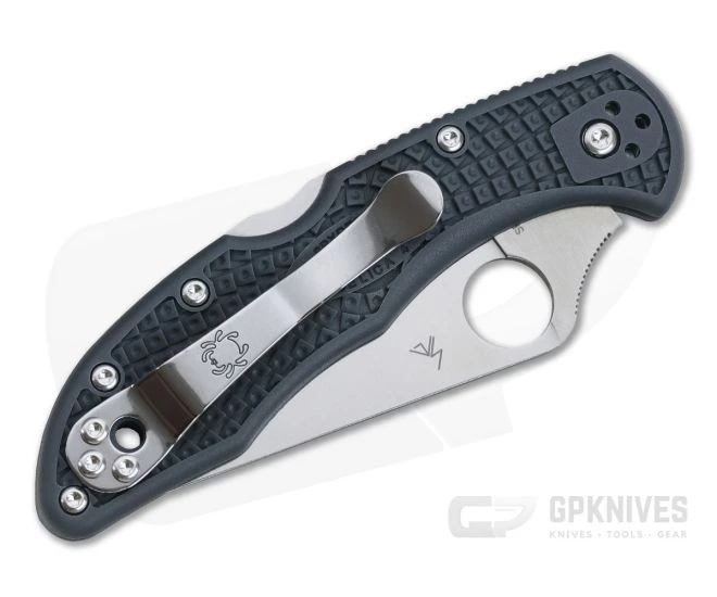 Handle: Tough, lightweight FRN with equipped with Spyderco’s trademark bi-directional texturing offers security in hand even in such a small package and come in a handsome Dark Gray color. A classic lock back mechanism offers security in use. Paired with the classic back lock the 4-Position Hour Glass clip offers multiple carry options for both left and right handed users.