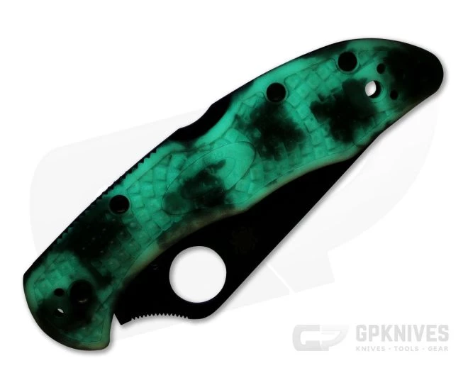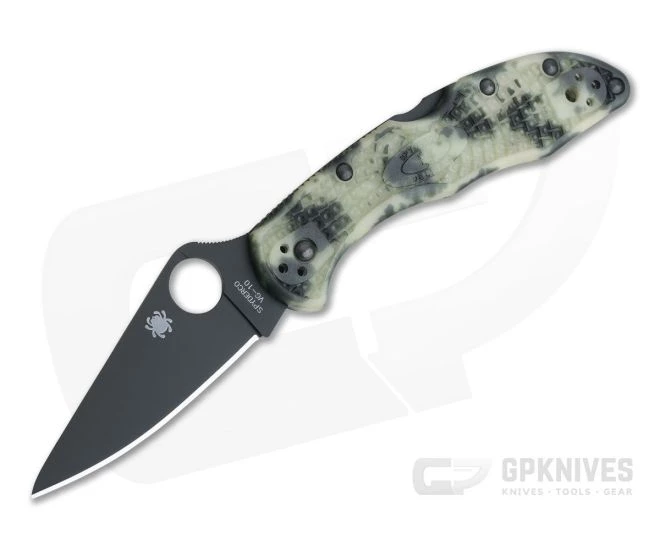 Spyderco’s Delica has been a cornerstone of their everyday carry product line since its introduction in 1990. The 4th Generation of the Delica lightweight was upgraded with a 13 mm RoundHole, spine jimping, reinforced blade tip, skeletonized liners, Bi-Directional Textured FRN scales and a four-position screw on clip. A new twist on the fully flat ground Delica 4 model is the introduction of unique Zome handle colors. This Limited Run distributor exclusive comes with a fully flat ground, Black TiCN coated, plain edge VG10 blade and Glow-In-the-Dark Desert Zome FRN handles. Available while supplies last.