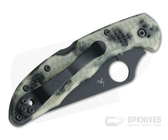 Handle: Spyderco’s Bi-directional textured FRN in Desert Zome offers exceptional traction in the hand with contoured edges and an ergonomic design that delivers comfort in the hand until the job is done. This Limited distributor exclusive is further enhanced with a Glow-in-the-Dark base to the FRN for added style and easy location in low light conditions. A sturdy mid-back lock design is easy to operate and comes with the Boye Dent further enhancing the security by preventing accidental disengagement of the lock when gripping the handle with heavy pressure. A hole at the pommel end allows for easy lanyard attachment. Back spring, hardware and clip are all black coated to match the blade.