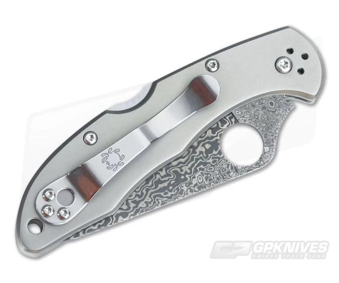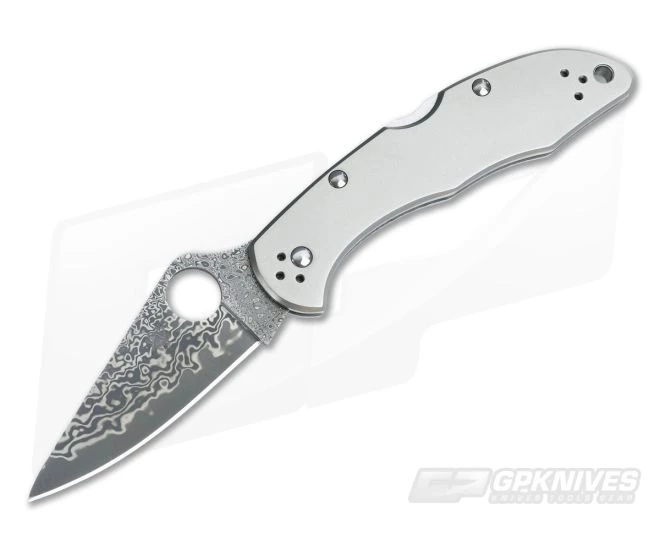 Spyderco’s Delica has been a cornerstone of their everyday carry product line since its introduction in 1990. The 4th Generation of the Delica was upgraded with a 13 mm RoundHole, spine jimping, reinforced blade tip and a four-position screw on clip. The premium edition of the fully flat ground Delica 4 model offers the same great platform with a huge upgrade in materials that is sure to be a favorite for users and collectors alike. This version comes with a plain edge, modified drop point blade made from D.P.S. 15 Damascus with a VG10 core and solid titanium handles.