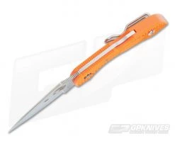 Handle: Linerless Orange FRN handles are durable, lightweight and impervious to the elements with contoured edges for comfort and exceptional traction in the hand thanks to the Bi-Directional texturing. Orange FRN delivers the same great performance in a high visibility color that you are more likely to find should you misplace your knife. Ergonomic in design, the pommel end forms a perfect pinky finger shelf for added leverage. The combination of index choil and pinky shelf offer plenty of grip area in a compact package. A sturdy mid-back lock design offers rock solid lock up and reliable security in use while the Boye Dent prevents accidental disengagement of the lock when gripping the handle with heavy pressure. A hole at the pommel end allows for easy lanyard attachment for added grip area.