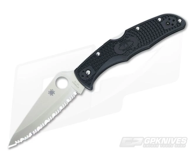 Spyderco’s Endura, big sister to the Delica, has been a cornerstone of their everyday carry product line since its introduction in 1990. The 4th Generation of the Endura lightweight was upgraded with a 13Â mm RoundHole, spine jimping, reinforced blade tip, skeletonized liners, Bi-Directional Textured FRN scales and a four-position screw on clip. This Saber Ground version comes with a satin finished, fully serrated SpyderEdge, modified drop point, VG-10 blade and Black FRN handles.
