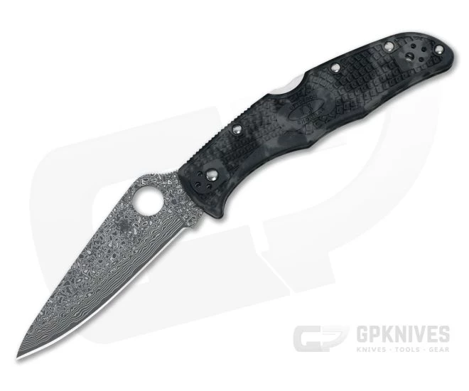 Spyderco’s Endura, big sister to the Delica, has been a cornerstone of their everyday carry product line since its introduction in 1990. The 4th Generation of the Endura lightweight was upgraded with a 13 mm RoundHole, spine jimping, reinforced blade tip, skeletonized liners, Bi-Directional Textured FRN scales and a four-position screw on clip. Adding style to the Endura line is the unique Zome handle series. This Limited Run version comes with a saber ground D.P.S. 15 Damascus/VG10 laminate blade and gray and black Zome FRN handles.