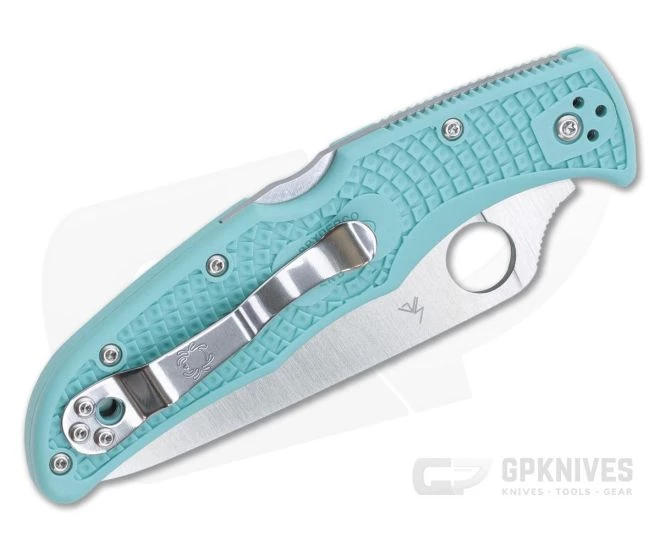 Handle:Â Tough, lightweight Teal flavored FRN equipped with Spyderco’s trademark bi-directional texturing offers security in hand in multiple grip positions. This limited Sprint run comes in a striking Teal blue color. A classic lock back mechanism offers security in use and fully ambidextrous operation when paired with RoundHole and 4-position clip. Thanks to the slim profile and sub 3.5 oz weight the Endura offers an exceptional Edge:Weight ratio.