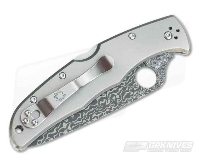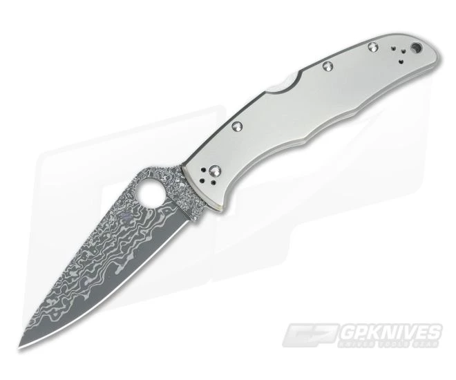 Spyderco’s Endura, big sister to the Delica, has been a cornerstone of their everyday carry product line since its introduction in 1990. The 4th Generation of the Endura was upgraded with a 13Â mm RoundHole, spine jimping, reinforced blade tip and a four-position screw on clip. The premium edition of the fully flat ground Endura 4 model offers the same great platform with a huge upgrade in materials that is sure to be a favorite for users and collectors alike. This version comes with a plain edge, modified drop point blade made from D.P.S. 15 Damascus with a VG10 core and solid titanium handles.