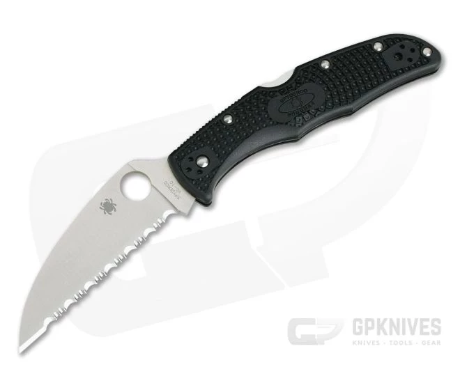 Spyderco’s Endura, big sister to the Delica, has been a cornerstone of their everyday carry product line since its introduction in 1990. The 4th Generation of the Endura lightweight was upgraded with a 13Â mm RoundHole, spine jimping, reinforced blade tip, skeletonized liners, Bi-Directional Textured FRN scales and a four-position screw on clip. A new twist on this classic is the introduction of the straight edge Wharncliffe blade profile. This Fully Flat Ground version comes with a fully serrated SpyderEdge Wharncliffe blade of stainless Japanese VG10 and Black FRN handles.