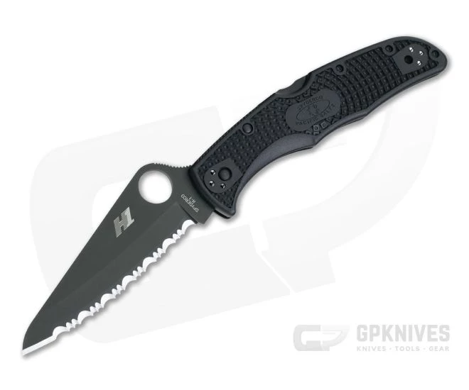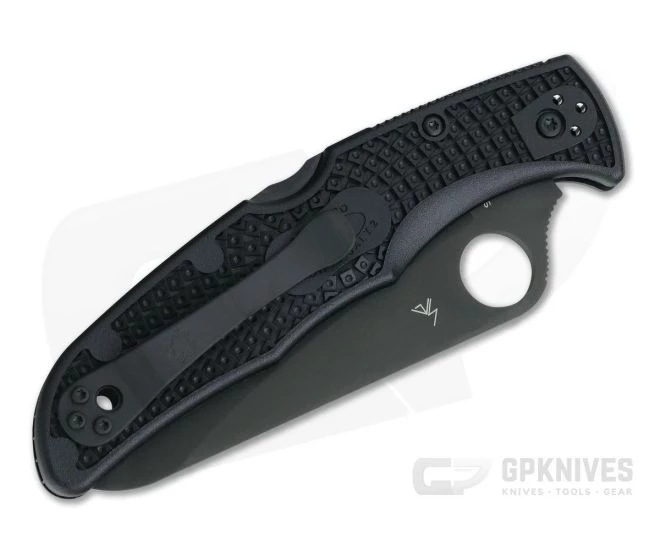 Having endured extensive military testing and issued in aircrew survival kits, the Pacific Salt 2 updates this classic Salt line folder with the ergonomic Gen 4 Endura handles with Bi-Directional textured FRN and 4-position pocket clip while retaining the ultra-corrosion resistant H-1 steel blade. CQI enhanced, the Pac Salt 2 is built with a linerless construction for an even lighter weight and durable, non-reflective titanium carbonitride (TiCN) coated hardware and back lock bar. This version comes with a black TiCN coated, fully Serrated SpyderEdge blade and black FRN handles.