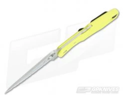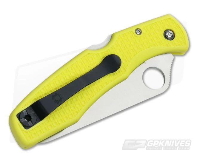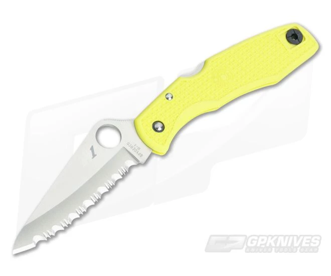 Spyderco Pacific Salt Yellow with fully serrated H-1 super stainless steel blade. H-1 is an alloy steel developed to stay 100% rust free, even in salt water, while still holding an edge comparable to other high-carbon steels on the market. Yellow FRN handle with lanyard hole and front lock featuring David Boye dent. Reversible black titanium pocket clip for left or right handed tip up carry.