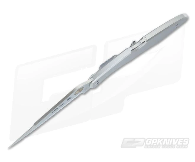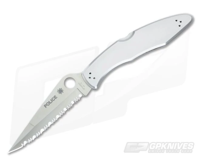 Spyderco Police Model with fully serrated VG-10 stainless steel blade. Full satin finished stainless steel handle. Back lock features David Boye dent. Stainless steel 4-position pocket clip for tip up or down left or right hand ambidextrous carry.
