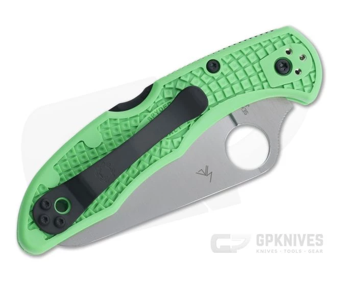 Based on the military tested and issued Pacific Salt 2, the Salt 2 is a smaller version built on the ergonomic Gen 4 Delica handles platform with Bi-Directional textured FRN and 4-position pocket clip. The Salt 2, continues Spyderco’s program of Constant Quality Improvement or CQI, offering an even lighter weight and corrosion resistant linerless construction and Titanium Carbo-Nitride (TiCN) coated hardware and back lock bar. The newest iteration of the Salt 2 comes with a full flat grind LC200N stainless steel blade and Key Lime Green FRN handles. This version comes with a plain cutting edge.