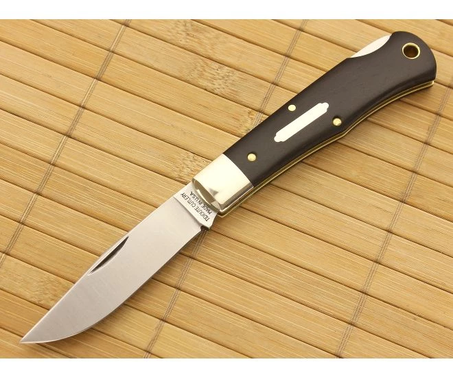 Tidioute #83LB Tascosa Little LockBack pattern is a single Clip blade folder with handsome Gabon Ebony Wood handle scales and lock back mechanism. The Tascosa has one clip point satin finished 1095 carbon steel blade attached to a single nickel silver bolster. The Tascosa is lightweight, thin and smooth functioning perfect for daily carry. Continuing with the Tidioute tradition are smooth ebony wood handle scales pinned to the brass liners. Includes lanyard tube and a pinned traditional shield. Each knife comes in unique tube packaging with company information on the front. Brand new direct from Great Eastern Cutlery.