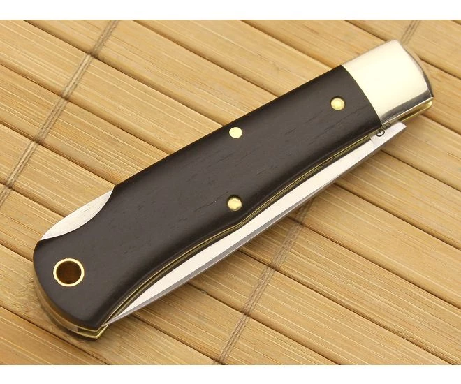 Tidioute #83LB Tascosa Little LockBack pattern is a single blade folder with handsome Gabon Ebony Wood handle scales and lock back mechanism. The Tascosa has one drop point satin finished 1095 carbon steel blade attached to a single nickel silver bolster. The Tascosa is lightweight, thin and smooth functioning perfect for daily carry. Continuing with the Tidioute tradition are smooth ebony wood handle scales pinned to the brass liners. Includes lanyard tube and a pinned traditional shield. Each knife comes in unique tube packaging with company information on the front. Brand new direct from Great Eastern Cutlery.