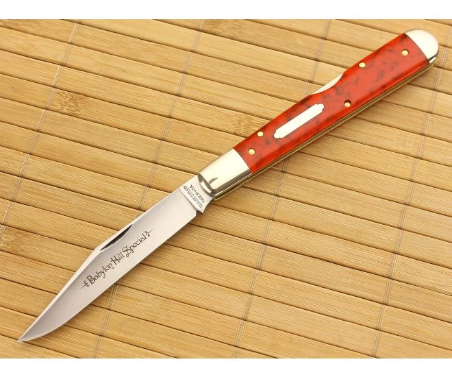 Named after an area overlooking Tidioute, PA the #64 Babylon Hill Special pocket knife with Fire Brick Acrylic is one finely crafted folder. This is a nice, long single blade locking folder that functions smoothly with killer looks to boot.