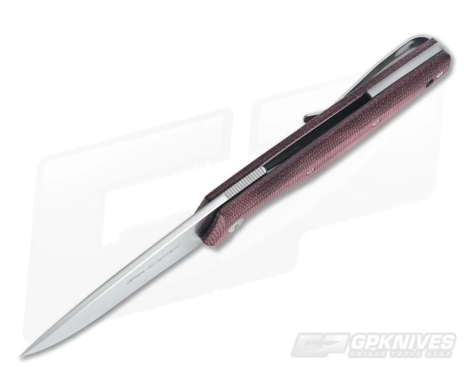 The Handle: The handles are ergonomic and contoured to provide comfort and security even during long use. This version has Burgundy Canvas Micarta scales attached to nested stainless steel liners. The liners also contain the Action Stopper mechanism, a set of detent balls that deliver secure, non-locking operation that is similar to a slip joint. A partial titanium back spacer provides a solid mount for the reversible, tip-up, stainless steel deep carry clip. The slim and smooth design nearly disappears in the pocket.