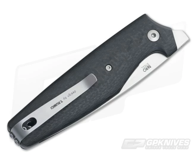 The Handle: The handles are ergonomic and contoured to provide comfort and security even during long use. This version has elegant Carbon Fiber scales attached to nested stainless steel liners. The liners also contain the Action Stopper mechanism, a set of detent balls that deliver secure, non-locking operation that is similar to a slip joint. A partial titanium back spacer provides a solid mount for the reversible, tip-up, stainless steel deep carry clip. The slim and smooth design nearly disappears in the pocket.