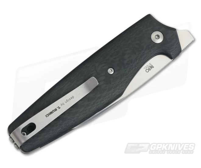 The Handle: The handles are ergonomic and contoured to provide comfort and security even during long use. This version has elegant Carbon Fiber scales attached to nested stainless steel liners. The liners also contain the Action Stopper mechanism, a set of detent balls that deliver secure, non-locking operation that is similar to a slip joint. A partial titanium back spacer provides a solid mount for the reversible, tip-up, stainless steel deep carry clip. The slim and smooth design nearly disappears in the pocket.