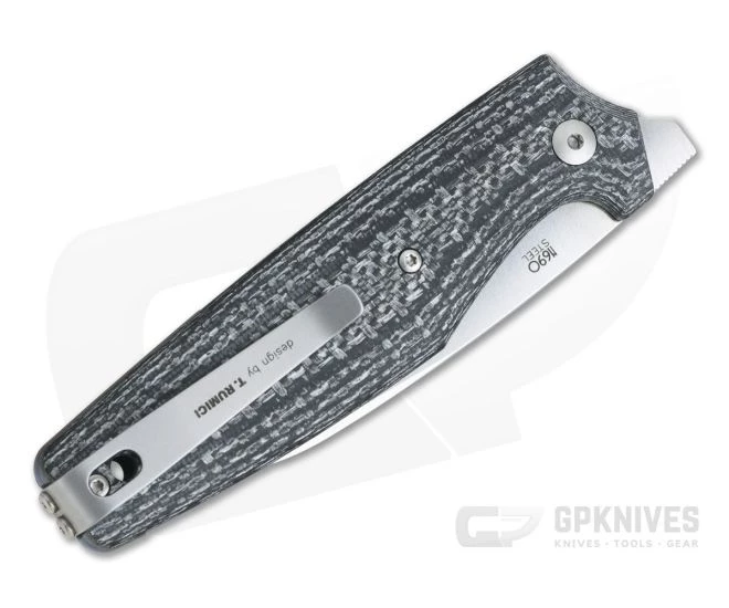 Blade: The Dan 2 sports a Wharncliffe blade made from N690. It has a highly attractive satin finish on the nearly full height flat grind and a slightly crowned spine adding to the classy look of this gentleman’s folder. A short swedge at the tip delivers a fine point for enhanced piercing as well as detail work. This is an everyday workhorse blade wrapped in a classy package.