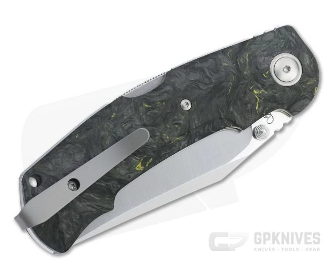 Handle: A modern design with classic lines, the handle offers a comfortable four finger grip for secure use. A subtle index guard and pommel hook provide added control and safety. Stainless steel liners support the full length carbon fiber scales, housing the blade and lock mechanism. The advanced lock back system retains the strength and function of a traditional back lock while using two wire springs for easier operation. Dark Matter Yellow Fat Carbon offers the performance of classic carbon fiber with added visual appeal.